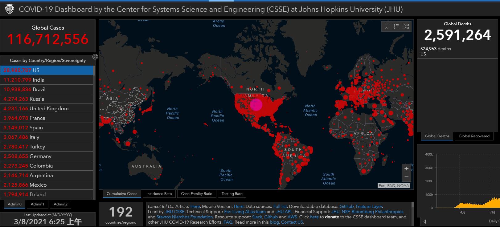 美國約翰斯·霍普金斯大學的統計數據顯示,截至香港時間3月8日6時25分,美國新冠肺炎累計確診病例已累計達到28985707例,累計死亡病例達到52463例。