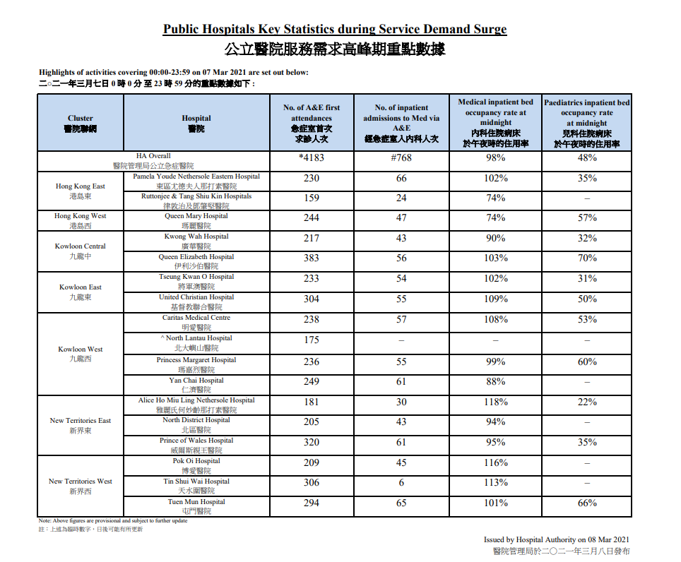 全港16間提供內科病床的公立醫院中,9間醫院的內科住院病床住用率超過100%,其中以雅麗氏何妙齡那打素醫院最高,達118%。此外,伊利沙伯醫院急症室最多人,單日錄得383人次。