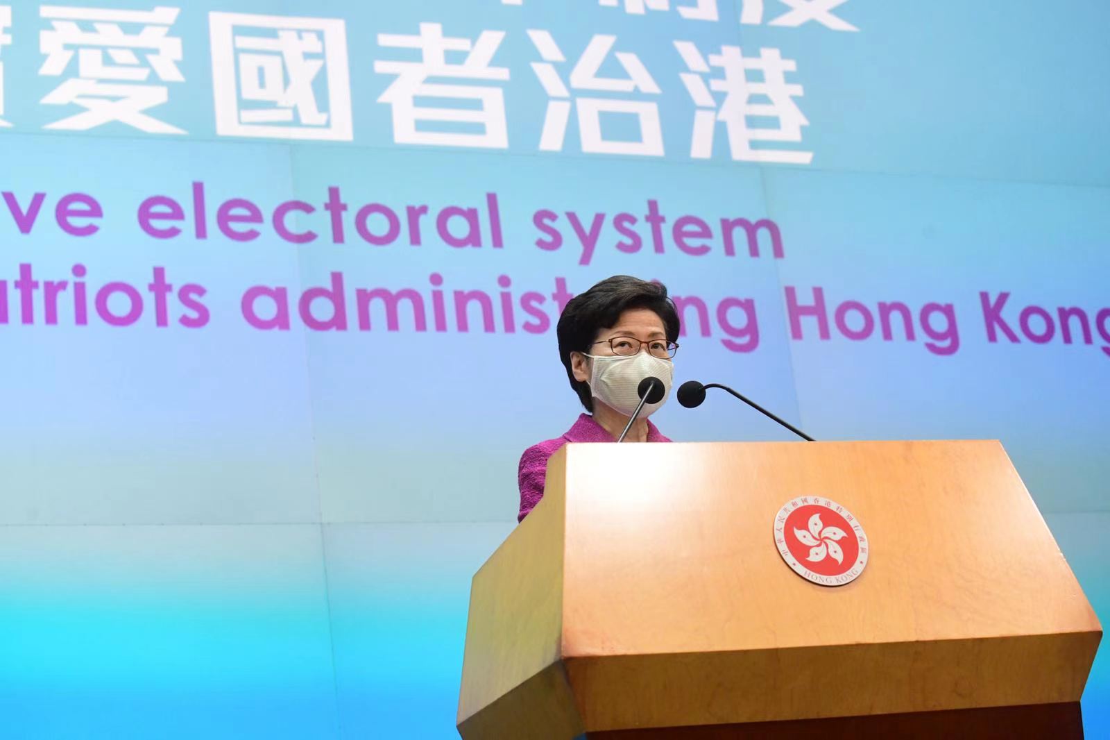 林鄭指,過去數年,立法會的亂象令施政舉步維艱,香港的選舉制度出現漏洞和缺陷,特區難以自行處理,她感謝中央繼訂立香港國安法後,從憲制層面,擔起責任,行使中央權力,為香港解困。她認為,確保管治權掌握在愛國者手上,才可全面準確貫徹落實「一國兩制」,她和特區政府都非常歡迎和支持相關工作,特區政府會全面配合,全力以赴,完成使命。