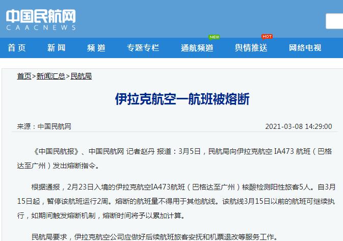 據中國民航網今日消息,3月5日,民航局向伊拉克航空 IA473 航班(巴格達至廣州)發出熔斷指令。