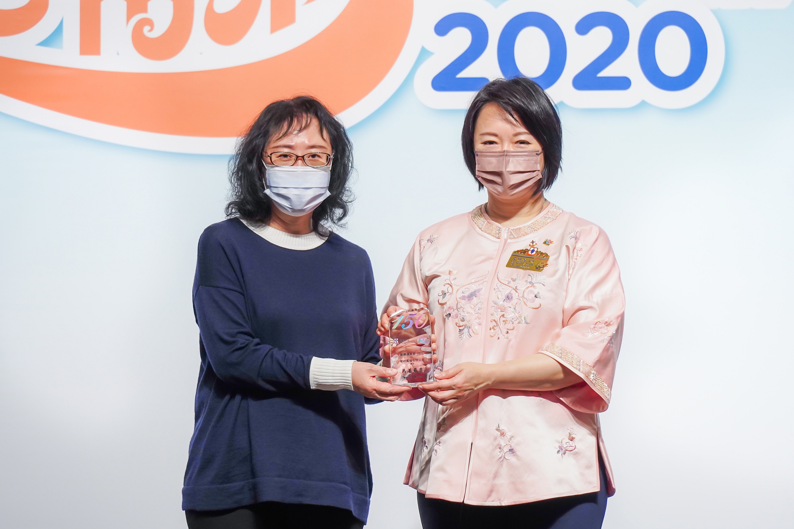 東華三院主席文頴怡致送紀念品予電視廣播有限公司代表非戲劇分部經理何小慧。