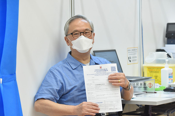 約100名優先接種組別人士今日(8日)在設於中山紀念公園體育館的社區疫苗接種中心接種復必泰疫苗。圖為前行政長官曾蔭權在中心接種新冠肺炎疫苗後展示接種紀錄。