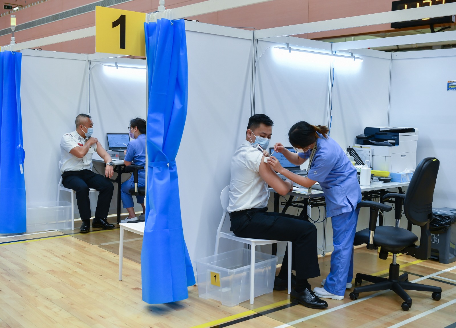 今日(8日)接種疫苗的人士包括醫護人員、空中服務員,以及來自6個紀律部隊的人員。