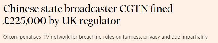 英國通訊管理局指CGTN前年(2019年)製作的多個關於港修例風波的節目「涉嫌違反英國廣播條例的中立原則」,罰款12.5萬英鎊(約134萬港元)。此外,因CGTN播放英國藥企葛蘭素史克(GSK)在華聘請的私家偵探韓飛龍(Peter Humphrey)2013年在鏡頭前「認罪」片段另罰10萬英鎊(約107萬港元)。