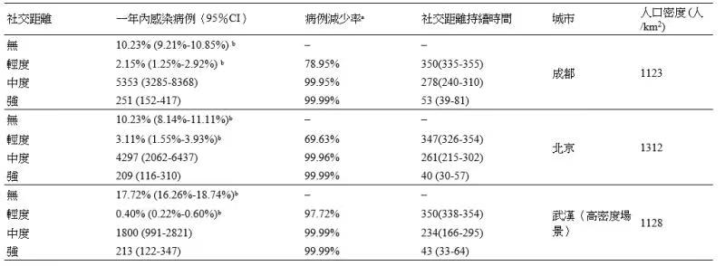 研究團隊假設達致群體免疫的1年內新冠肺炎疫苗接種率為64%,疫苗有效率為75%,在中等人口密度之城市,即約一半武漢市,接種疫苗可縮短36至78%實施社交距離措施的時間;對於人口稠密城市如武漢市,接種新冠肺炎疫苗可降低社交距離措施強度,並縮短新一波疫情持續時間及減少病例數目。