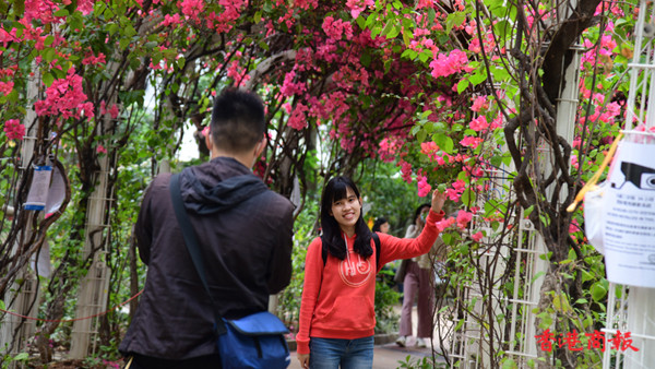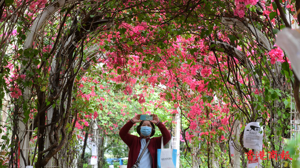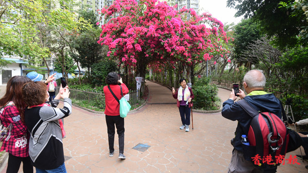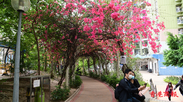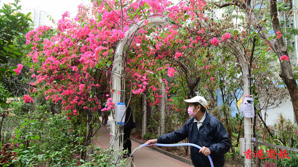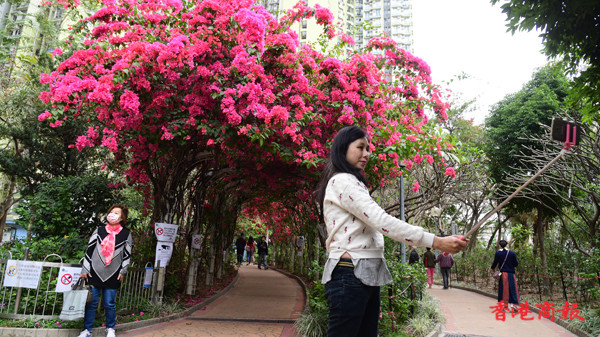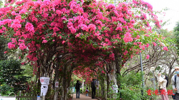 近日不少市民四出賞花,深水埗元州邨內有一條長達30米的簕杜鵑花隧道,更享有羅馬隧道的美譽。每逢3月至4月,在元州邨這條花隧道中,嫣紅色的簕杜鵑花盛放,再配上數以十朵不同綻放的鮮花,就如舖滿整條鮮花隧道一樣。