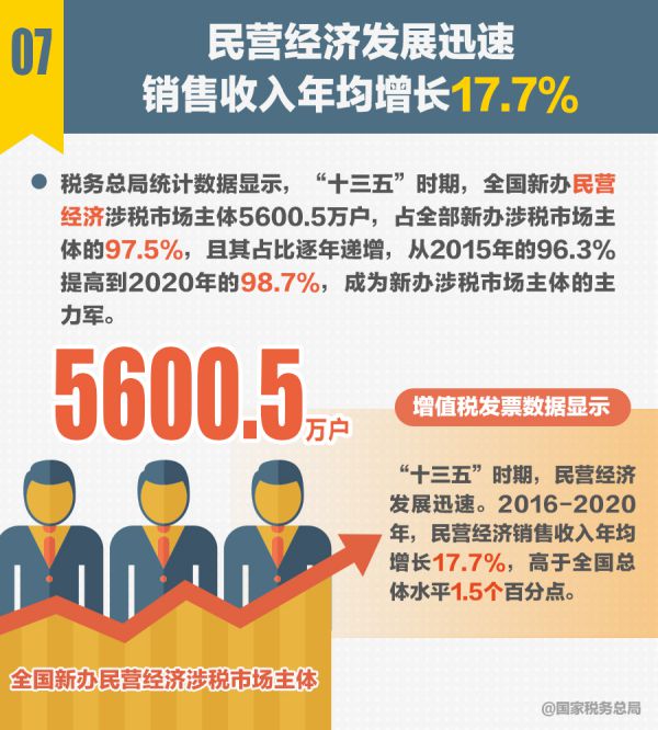 稅務總局統計數據顯示,「十三五」時期,全國新辦民營經濟涉稅市場主體5600.5萬戶,佔全部新辦涉稅市場主體的97.5%,且其佔比逐年遞增,從2015年的96.3%提高到2020年的98.7%,成為新辦涉稅市場主體的主力軍。