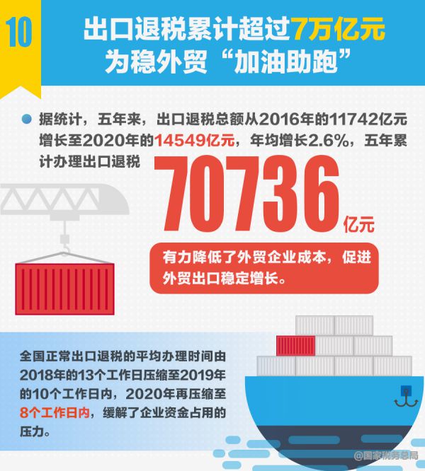 對外貿易是我國開放型經濟的重要組成部分和國民經濟發展的重要推動力量。為進一步擴大對外開放,穩住外貿基本盤,「十三五」時期,我國多次提高出口退稅率,助力企業應對中美貿易摩擦影響和全球疫情的負面衝擊。據統計,五年來,出口退稅總額從2016年的11742億元增長至2020年的14549億元,年均增長2.6%,五年累計辦理出口退稅70736億元,有力降低了外貿企業成本,促進外貿出口穩定增長。