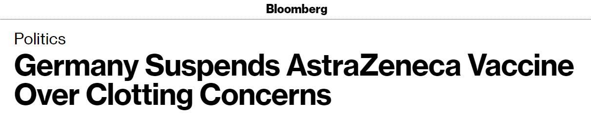 據彭博社剛剛消息,德國政府周一表示,由於與注射疫苗後引發嚴重血栓的報道,德國將暫停使用阿斯利康的新冠病毒疫苗。
