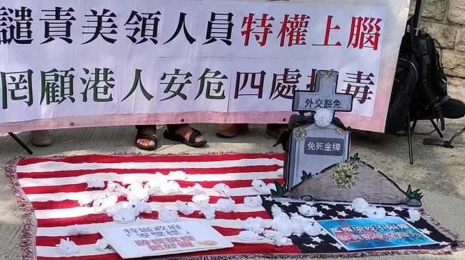 「愛港聯盟」亦到場抗議,召集人曹達明表示,目前新冠肺炎疫情嚴重,健身群組病毒擴散猛烈,中西區與半山都十分危險。與此同時,日前又爆出住在舊山頂道的美領人員經區域強檢確診,理應即時隔離。可是,有傳聞指該兩名美領館外交人員竟以「外交人員擁有豁免權,拒絕送院隔離」。