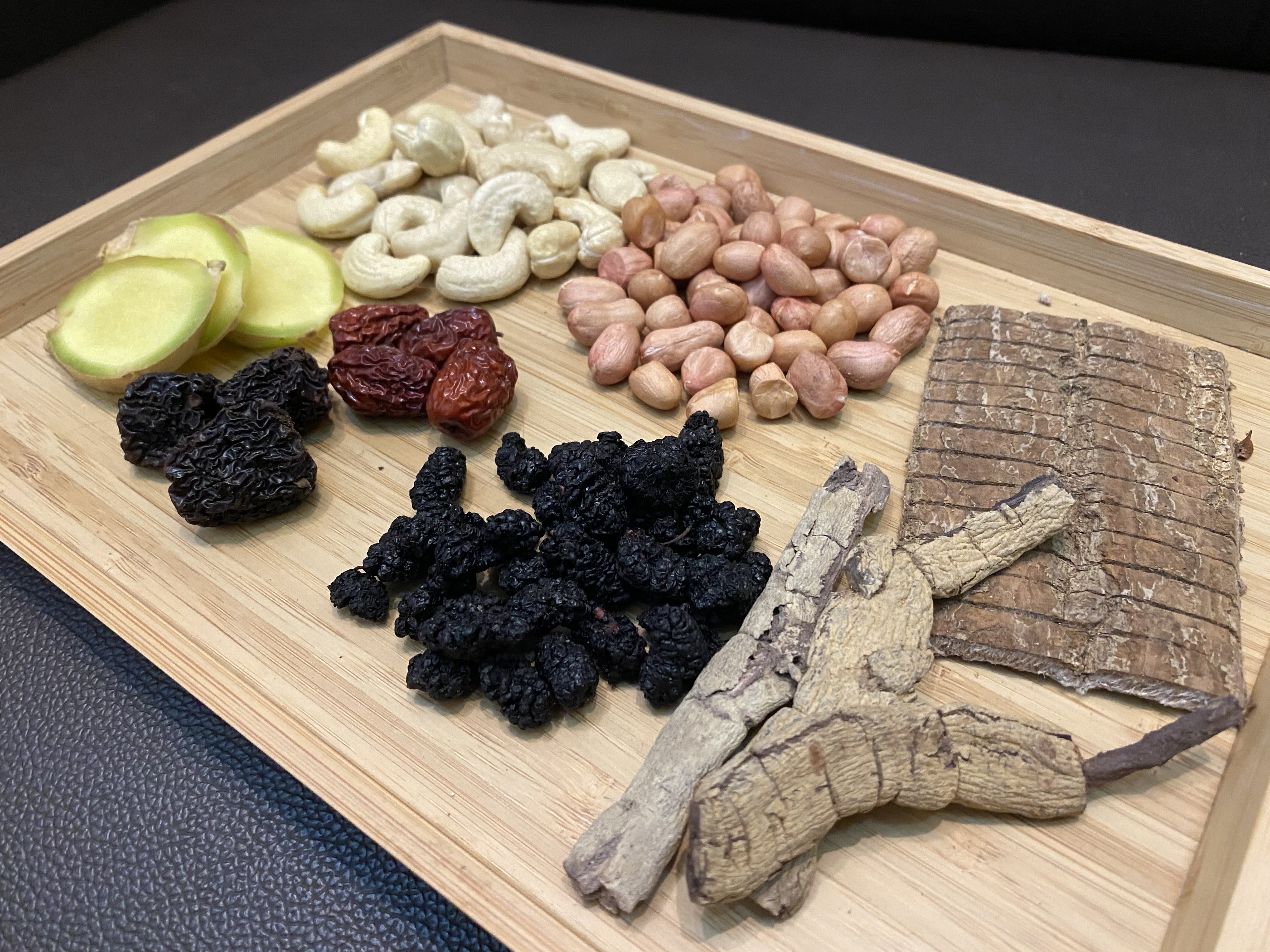 材料:雞腳10只、巴戟15克、杜仲15克、桑椹子15克、花生連衣30克、腰果30克、紅棗大棗20克、生薑3片。