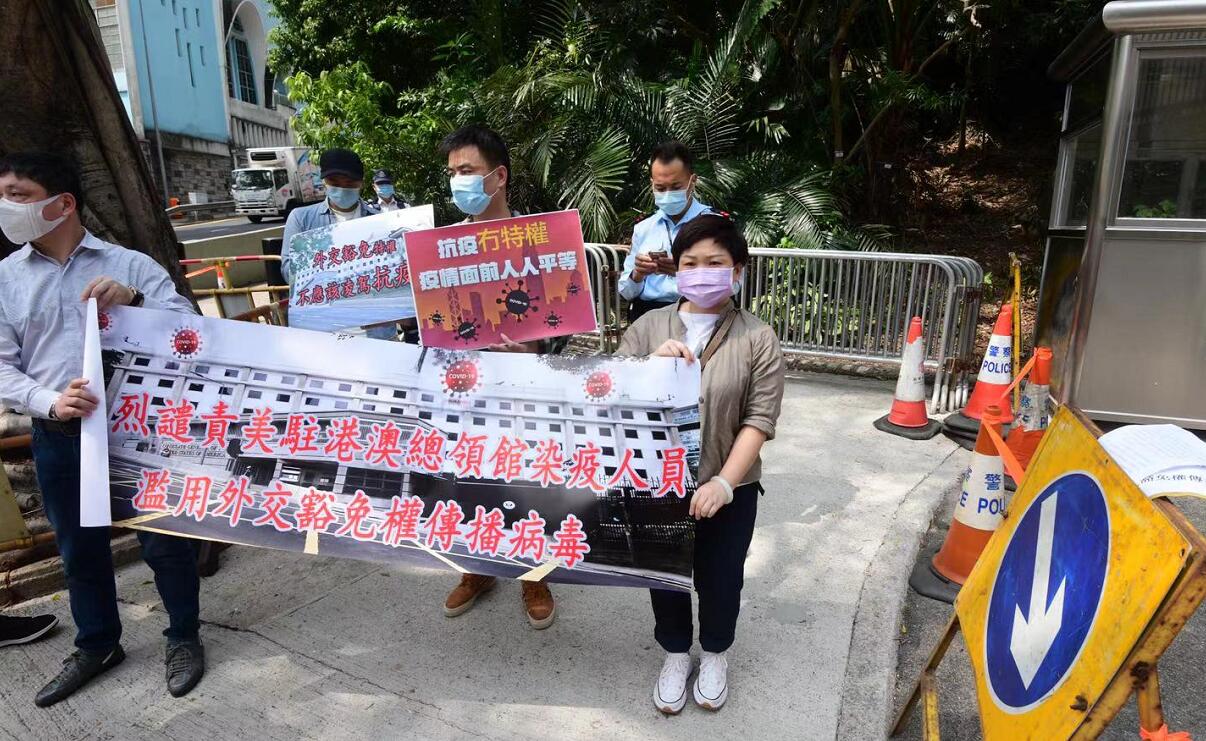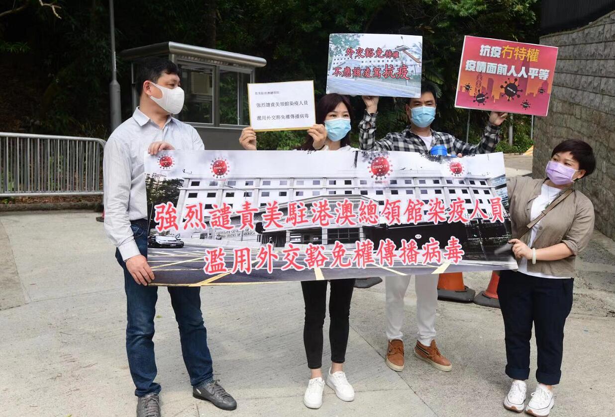美國駐港澳總領事館日前證實有2名職員對新冠病毒檢測呈陽性。有市民今早(17日)到美國駐港澳總領事館請願指,在全港市民積極抗疫時,卻有2名美領職員「禍港害港」,批評他們在封區強檢中檢測到初步陽性時,藉外交豁免權撒手離去。他們指,作為市民有責任、有義務維護香港衛生安全,故對該2名職員的行為表示憤慨與強烈譴責,希望美領舘可以當機立斷,徹查2人近日行蹤,公布相關消息,給全港市民一個可靠的交代。(記者 何加祺 攝影 崔俊良)