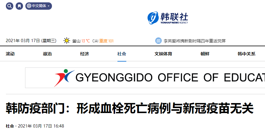 此前據報道,韓國疾病管理廳廳長鄭銀敬17日表示,韓國發現一例接種阿斯利康新冠疫苗後出現血栓的病例,這是在對死亡病例進行屍檢時發現的,死者是60多歲的女性。