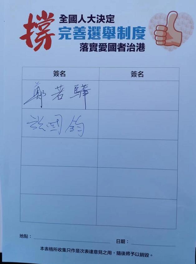 律政司司長鄭若驊連同民建聯副主席張國鈞、陳學鋒,今日(17日)到民建聯堅尼地城街站,簽名支持完善香港選舉制度,落實愛國者治港。