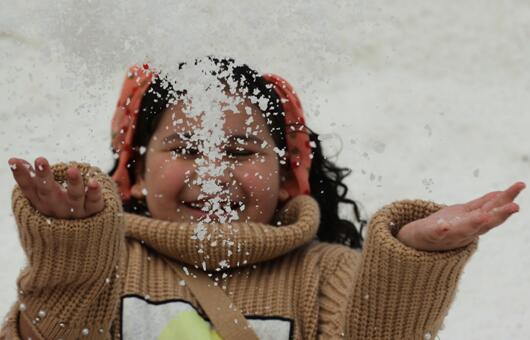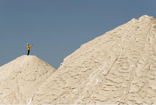 當地時間3月 12日,在埃及運河城市富阿德港,一名男子在參觀小鹽山,並使用手機拍照。而一位小女孩則在參觀期間捧起鹽粒灑向空中。
