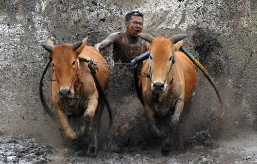 當地時間3月13日,在印尼蘇門答臘,一名騎師在為傳統的奔牛節Pacu Jawi訓練時鞭策他的牛。