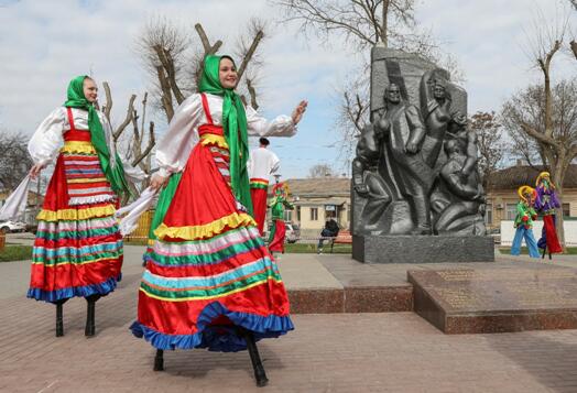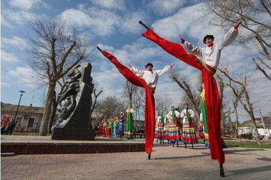 當地時間3月14日,在克里米亞,藝術家們在慶祝「煎餅周」期間在一座蘇聯時期的紀念碑附近表演。「煎餅周」是一個標誌着冬季結束的異教節日。