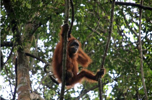 當地時間3月14日,在印尼,一隻蘇門答臘野生猩猩在樹間自由嬉戲。