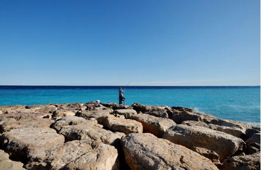 當地時間3月15日,在法國冠狀病毒爆發的情況下,一名男子在尼斯的海灘上釣魚。