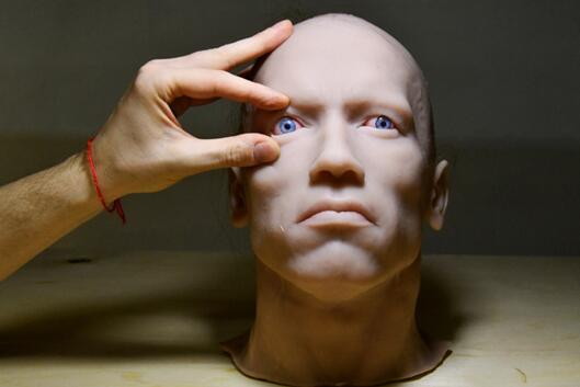 當地時間3月15日,在俄羅斯遠東城市符拉迪沃斯托克,一名研究人員在研究Promobot服務機器人製造商開發的仿人機械人的頭部構造。
