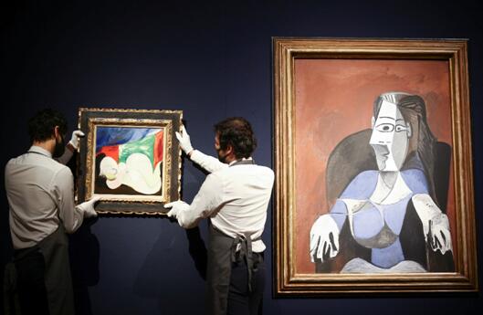 當地時間3月16日,在英國倫敦佳士得拍賣行,畫廊助理正在放置畢加索的作品。