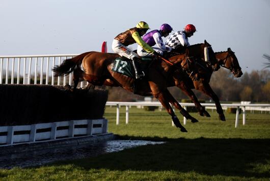 當地時間3月16日, 在英國切爾滕納姆賽馬場,選手們在比賽中騎馬跨越障礙的精彩瞬間。