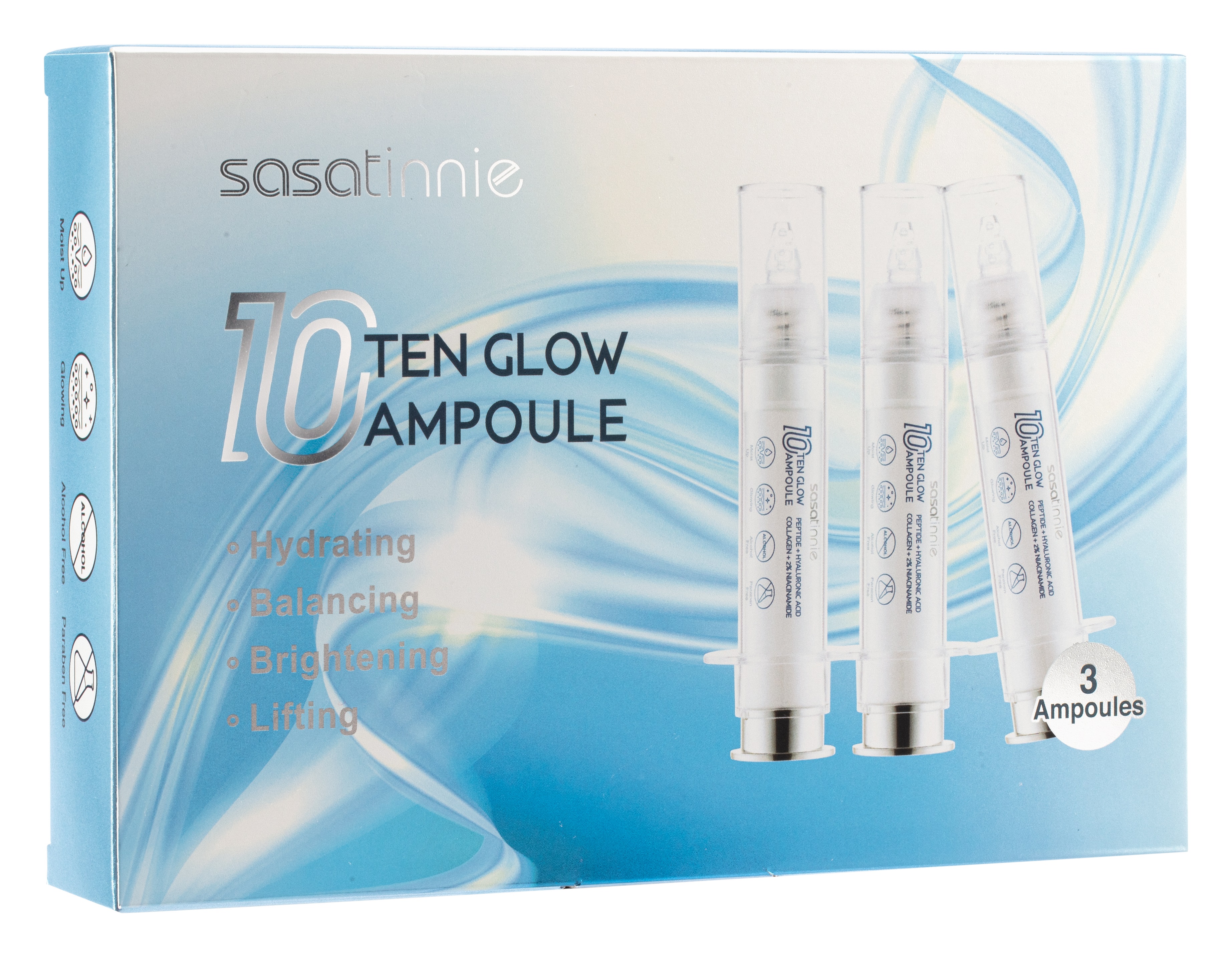 sasatinnie推出TEN GLOW AMPOULE全效⽔潤透光精華,透過7種透明質酸、六勝肽、⽔解膠原蛋⽩、煙醯胺,達⾄補濕、提亮膚⾊及抗皺緊致功效。精華亦含有覆膜酵⺟菌發酵產物濾液(Galactomyces),是清酒發酵過程中使⽤的成分,可將營養滲透肌膚底層。