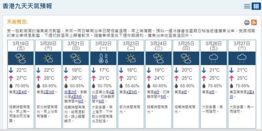 天文台表示,隨着季候風在下周中期緩和,廣東沿岸地區氣溫回升,下周五最低21度,最高25度,同時會有一兩陣雨。