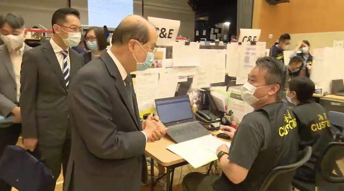 政務司司長張建宗今日(18日)視察設於啟德社區會堂的衞生署衞生防護中心個案追蹤辦公室,了解追蹤新冠肺炎確診個案接觸者的最新進展,並為工作人員打氣及肯定他們的努力。