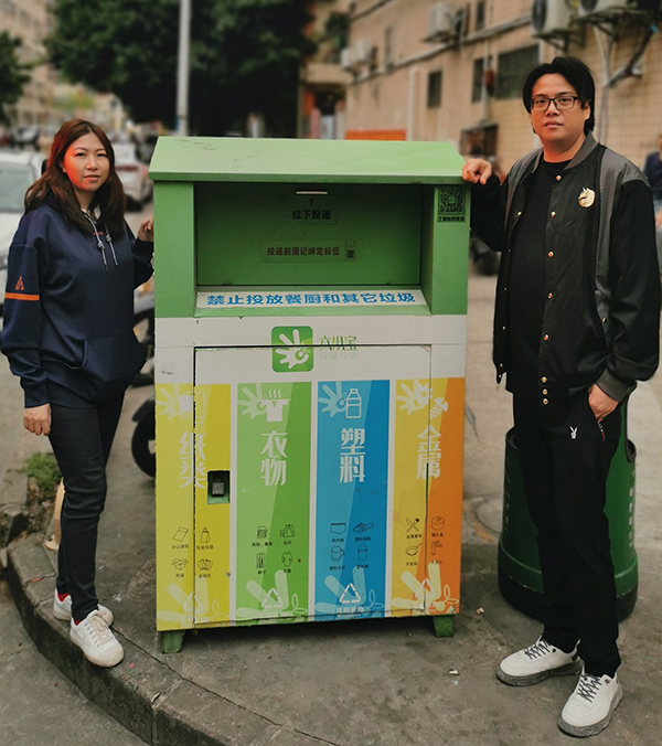 Wallace與妻子Niko在中山橫欄麗港花園的垃圾分類箱前