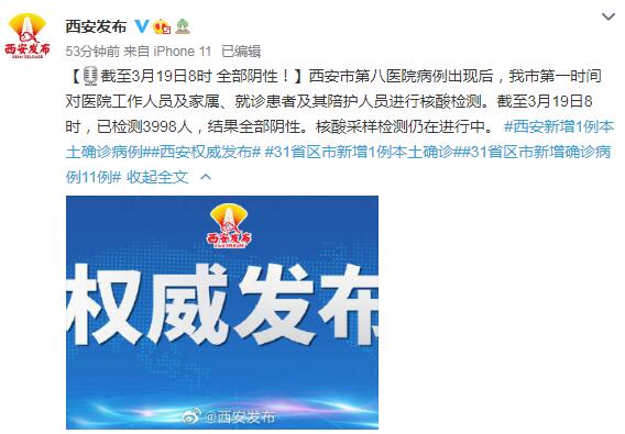 據西安市互聯網信息辦公室官方微博消息,西安市第八醫院病例出現后,西安市第一時間對醫院工作人員及家屬、就診患者及其陪護人員進行核酸檢測。截至3月19日8時,已檢測3998人,結果全部陰性。核酸採樣檢測仍在進行中。