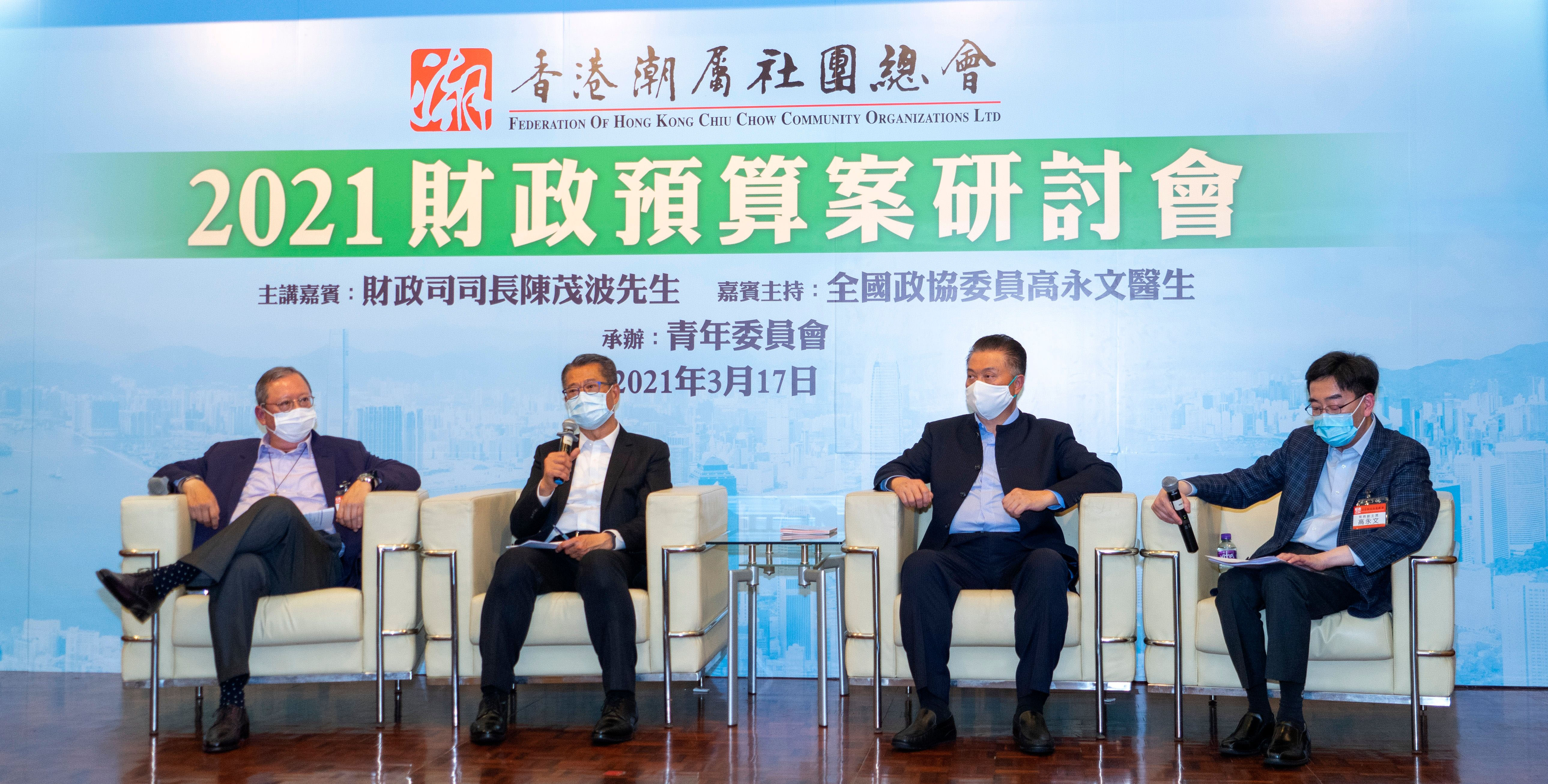 【香港商報訊】由香港潮屬社團總會主辦,潮總青年委員會承辦的2021財政預算案研討會,日前假潮州會館十樓大禮堂舉行。財政司司長陳茂波、中聯辦青年工作部副部長宋來蒞會,與潮總首長及青年委員會分享今年財政預算案的心得體會及指導青委會的工作。