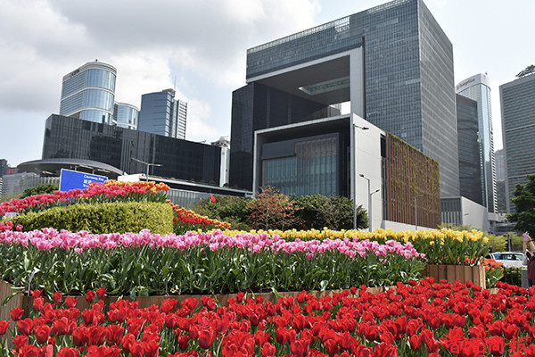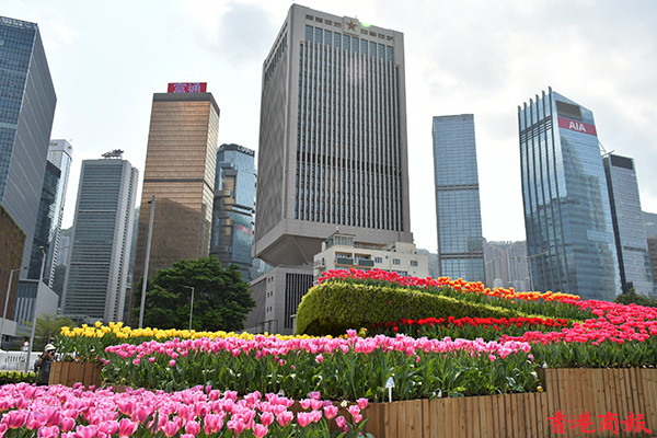花圃的鬱金香有橙、粉、紅、黃等多種顔色,與政府總部、中環的商業大廈、摩天輪等形成另一番美景,為疫情氣氛濃烈的中環,添上活力色彩。(馮瀚文 攝)