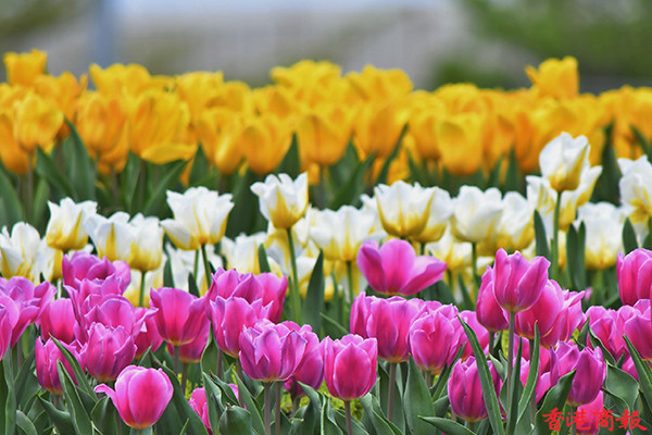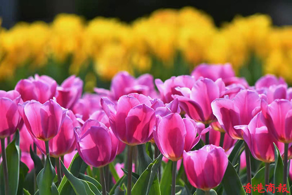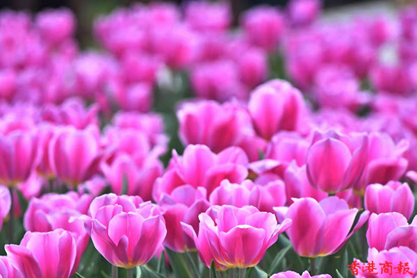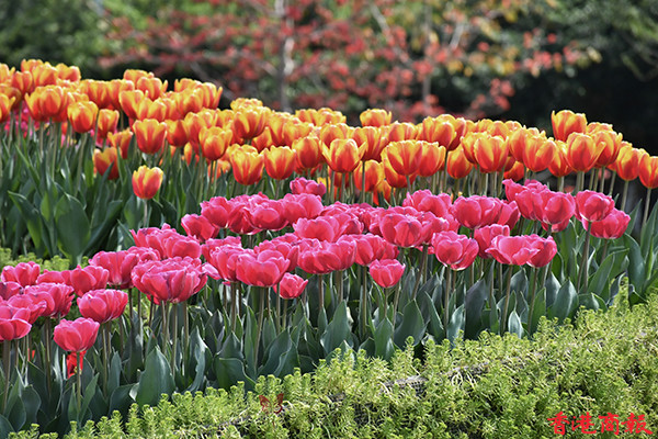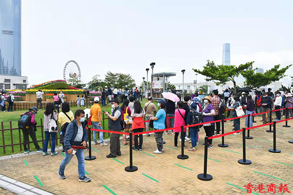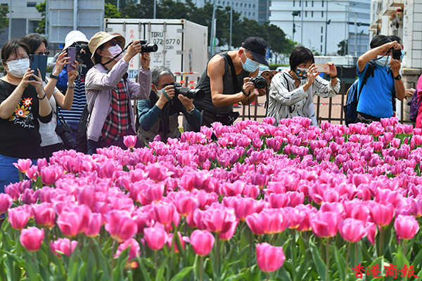 今年的維園花展移師全港18區舉行,在各區公園陸續設置不同主題的東方和西方園圃,其中位於金鐘添馬公園打造了一個名為「愛.花之旅」的鬱金香花圃,吸引不少「花迷」,有拿著長短鏡的攝影高手,也有拿手機的市民,只想為美艷的鬱金香留下倩影。由於疫情關係園方實施人流管制,花圃場地內每次只能容納80人,每人只能逗留10分鐘,所以不少愛花人仕來回排隊賞花影花。