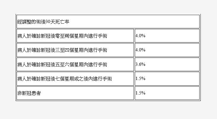 研究結果發現病人於確診新冠肺炎後0至4個星期內進行手術之術後30天死亡比率為4%、於確診5至6個星期內進行手術之術後30天死亡比率為3.6%、於確診7星期後進行手術之術後30天死亡比率為1.5%,與非新冠肺炎患者比率相同;而不論以病人年齡、病情、手術的緊急程度或等級等因素作評估,得出之結果均一致。