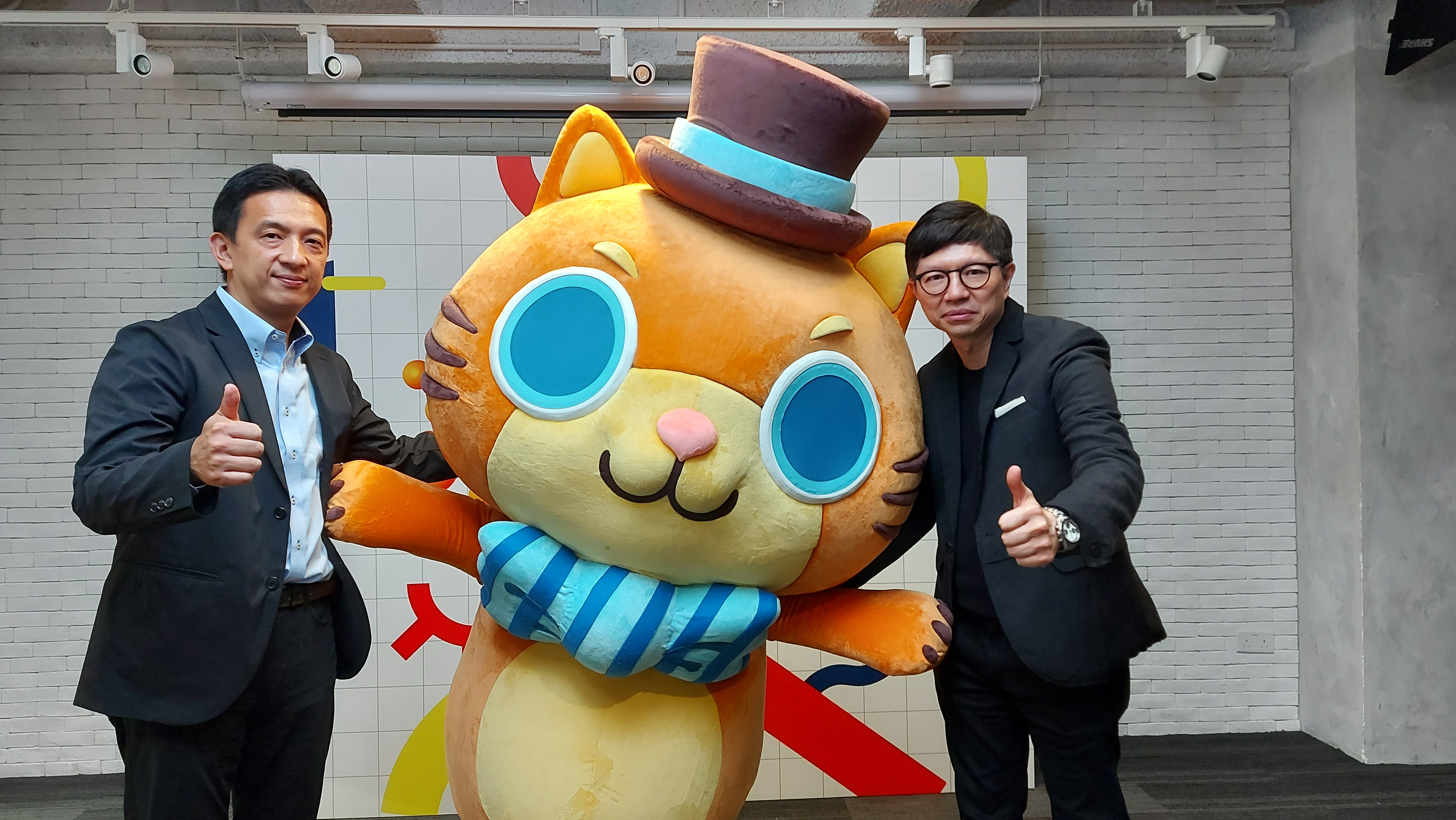 亞洲授權業協會創會會長陳立邁博士(右)及亞洲授權業協會理事近藤努(左)與獲得「香港授權業大獎2020」最佳香港原創授權角色設計獎金獎的「貓法師米卡」合照。