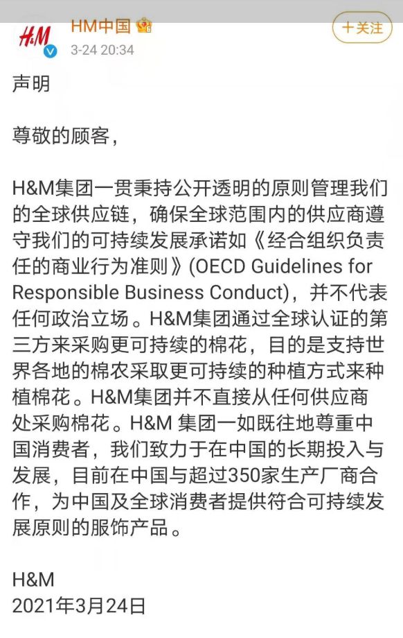 24日,HM中國發布聲明稱,H&M集團一貫秉持公開透明的原則管理全球供應鏈,確保全球範圍內的供應商遵守我們的可持續發展承諾如《經合組織負責任的商業行為準則》(OECD Guidelines for Responsible Business Conduct),並不代表任何政治立場。H&M集團通過全球認證的第三方來採購更可持續的棉花,目的是支持世界各地的棉農採取更可持續的種植方式來種植棉花。H&M集團並不直接從任何供應商處採購棉花。H&M集團一如既往地尊重中國消費者,我們致力於在中國的長期投入與發展,目前在中國與超過350家生產廠商合作,為中國及全球消費者提供符合可持續發展原則的服飾產品。