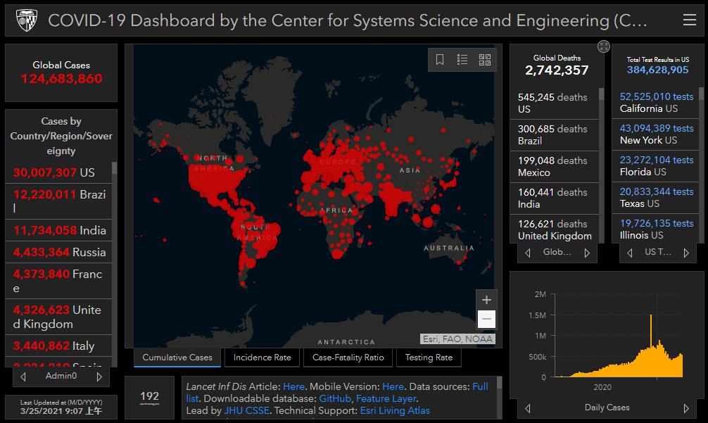與此同時,全球累計確診病例超過1.2億例,達至124683860例,其中死亡病例達到2742357例。