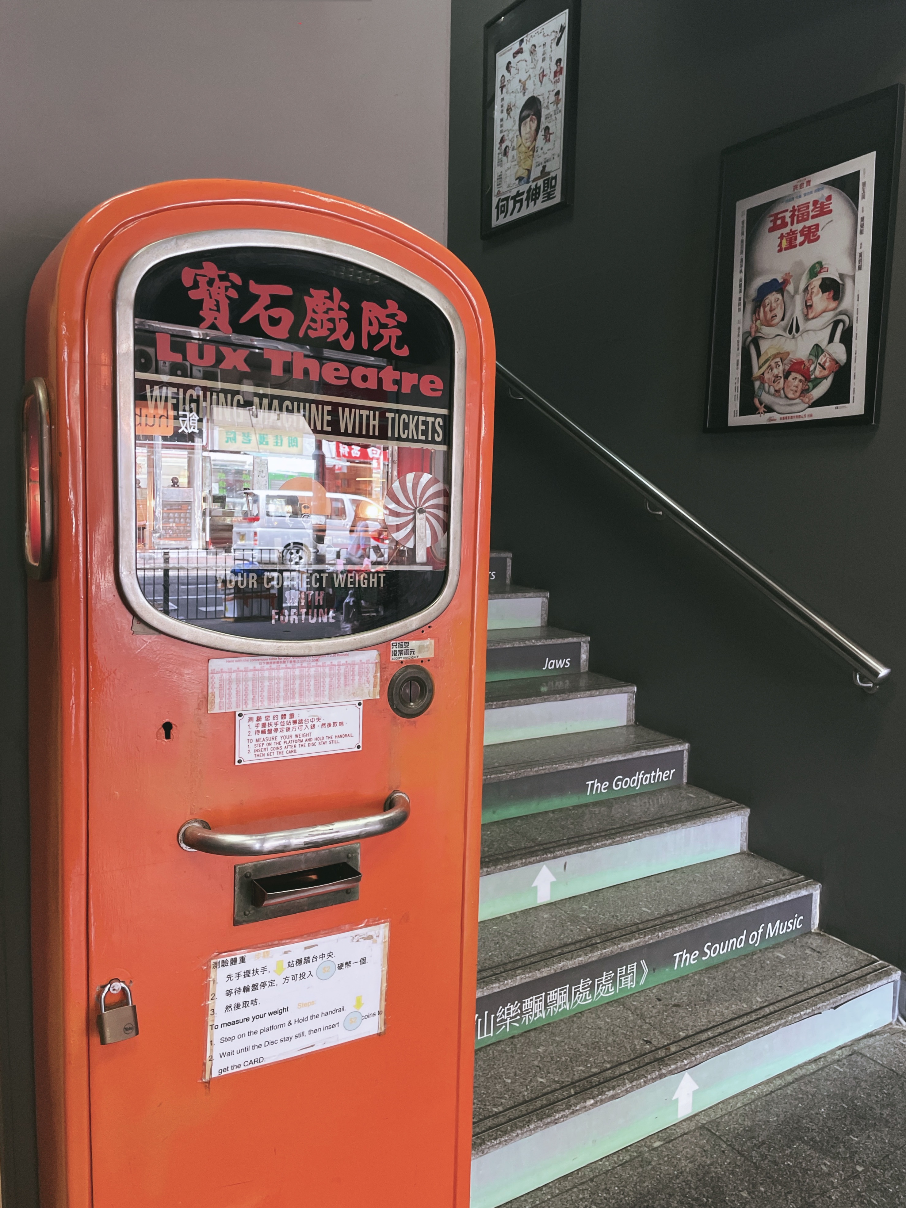 ②門前保留了舊式出卡磅重機,很多朋友大概不太知道這個機器。從60年代開始,很多傳統戲院都會在門前擺放這個機器,觀眾可以在入場前量體重。因為當時家庭里很難擺放巨大的體重計,這個機器就變得非常流行,每次測量只要2港幣。
