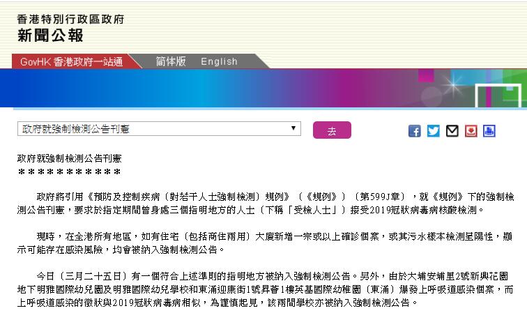 政府今晚(25日)刊憲,要求於本月12日至今曾身處3個指明地方超過兩小時的人士,於本周六(27日)或之前接受新冠病毒檢測。當中一座大廈因新增一宗或以上確診個案須強檢,為屯門龍門路43號龍門居第12座。