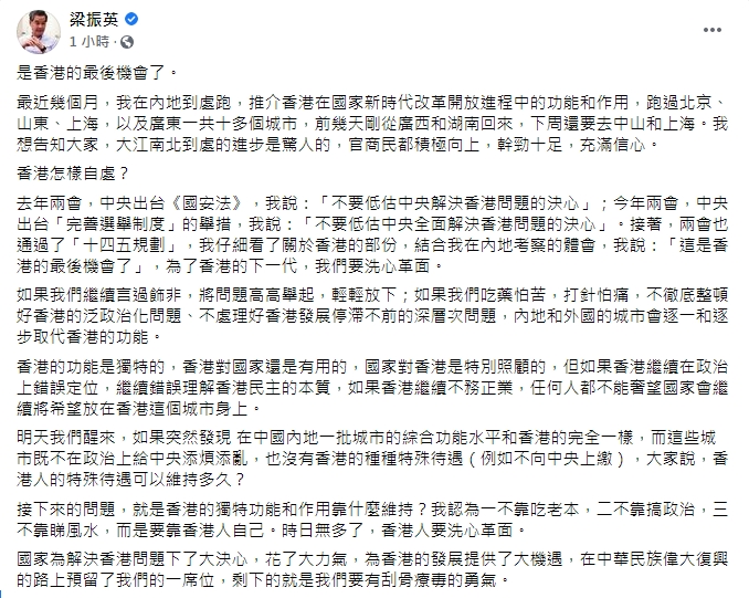 全國政協副主席、前特首梁振英在社交媒體發文稱,最近幾個月他在內地多個省市推介香港在國家新時代改革開放進程中的功能和作用,感受到內地進步是驚人的,官商民都積極向上,幹勁十足,充滿信心。而這「是香港的最後機會了」。