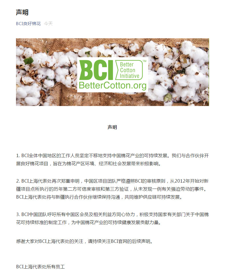 今日(26日)BCI發布聲明稱,3月26日,BCI全體中國地區的工作人員堅定不移地支持中國棉花產業的可持續發展。我們與合作夥伴開展良好棉花項目,旨在為棉花產區環境、經濟和社會發展帶來積極影響。以下為聲明全文: