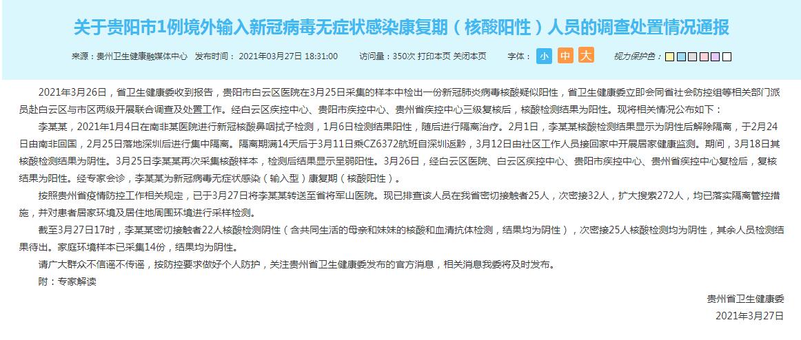 3月26日,貴州省衛生健康委收到報告,貴陽市白雲區醫院在3月25日採集的樣本中檢出一份新冠肺炎病毒核酸疑似陽性,經三級覆核後,核酸檢測結果為陽性。據專家研判,該人員屬於體內病毒又重新活躍起來的情況。有限的研究提示,這種病人的傳染性不強,目前還沒有觀察到造成傳播的案例。