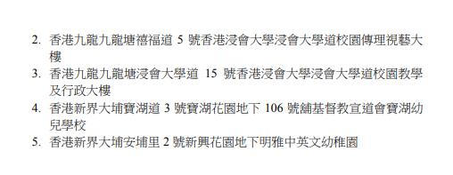 今日(29日)有27個符合上述準則的指明地方將被納入強制檢測公告。由於有確診個案曾到訪香港浸會大學三幢大樓,因此該三幢大樓亦被納入強制檢測公告。另外,由於大埔寶湖道3號寶湖花園地下106號鋪基督教宣道會寶湖幼兒學校和安埔里2號新興花園地下明雅中英文幼稚園爆發上呼吸道感染個案,而上呼吸道感染的徵狀與2019冠狀病毒病相似,為謹慎起見,該兩間學校亦被納入強制檢測公告。