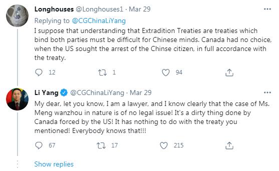 該推文引發網友熱議,外網眾多網友攻擊李楊大使,李楊大使一一進行了有力回擊!有網友指加拿大在孟晚舟案上別無選擇時,李楊說身為一名律師,他清楚的知道孟晚舟案沒有法律問題,完全是美國迫使加拿大作出的骯髒事。