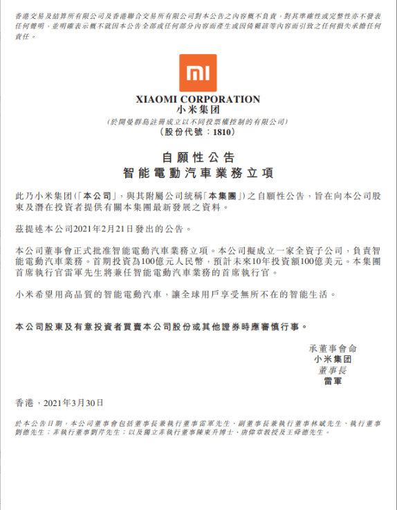 30日下午,小米集團發布公告稱,智能電動汽車業務立項。公告顯示,董事會正式批准智能電動汽車業務立項,擬成立一家全資子公司,負責智能電動汽車業務,首期投資為100億元人民幣,預計未來10年投資額100億美元,小米集團董事長兼行政總裁雷軍將兼任智能電動汽車業務的行政總裁。