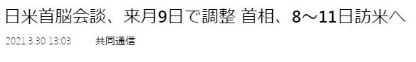 共同社30日引述政府消息人士表示,日本首相菅義偉下月8日啟程訪美,計劃9日與美國總統拜登會談;預計菅義偉的行程4天,11日回國。