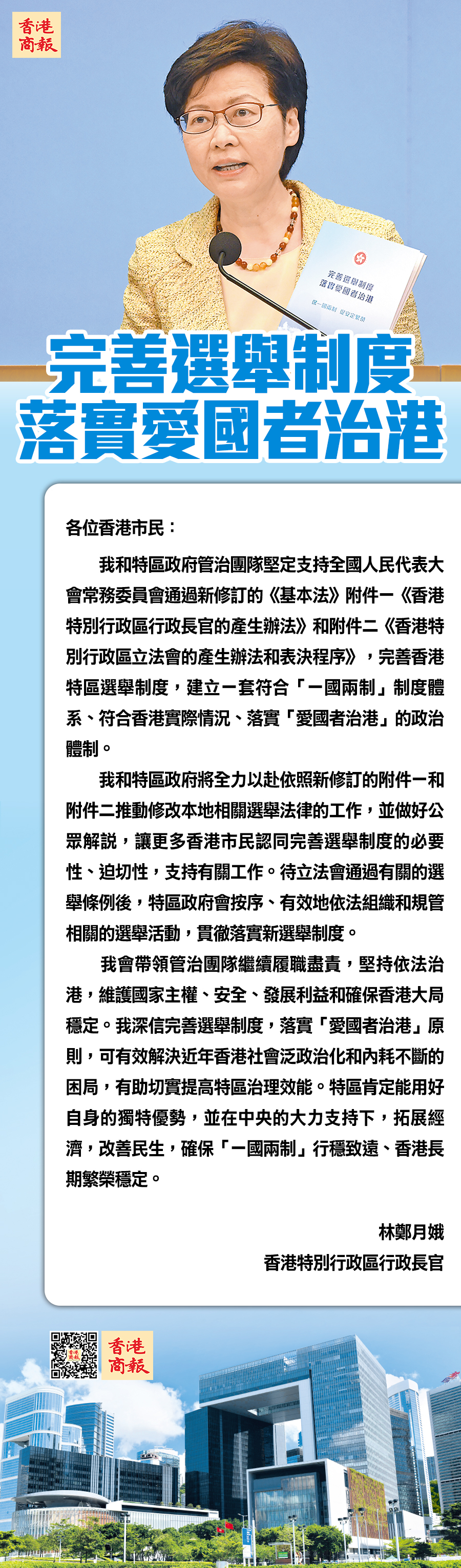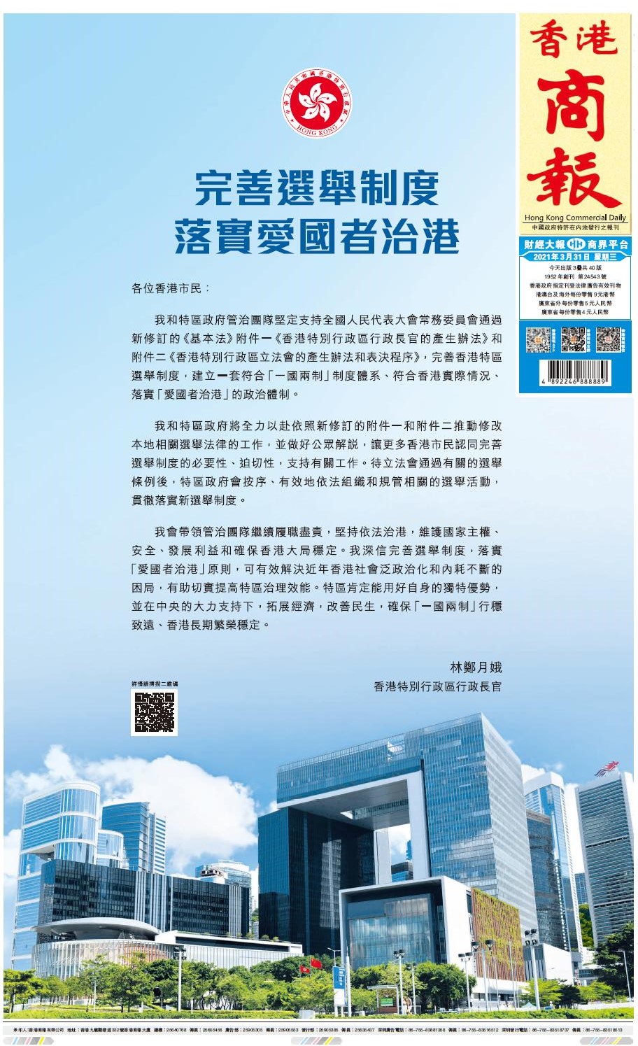 行政長官林鄭月娥今日(31日)在本報頭版發表致香港市民的公開信,她强调,深信完善選舉制度,落實「愛國者治港」原則,可有效解決近年香港社會泛政治化和內耗不斷的困局,有助切實提高特區治理效能。