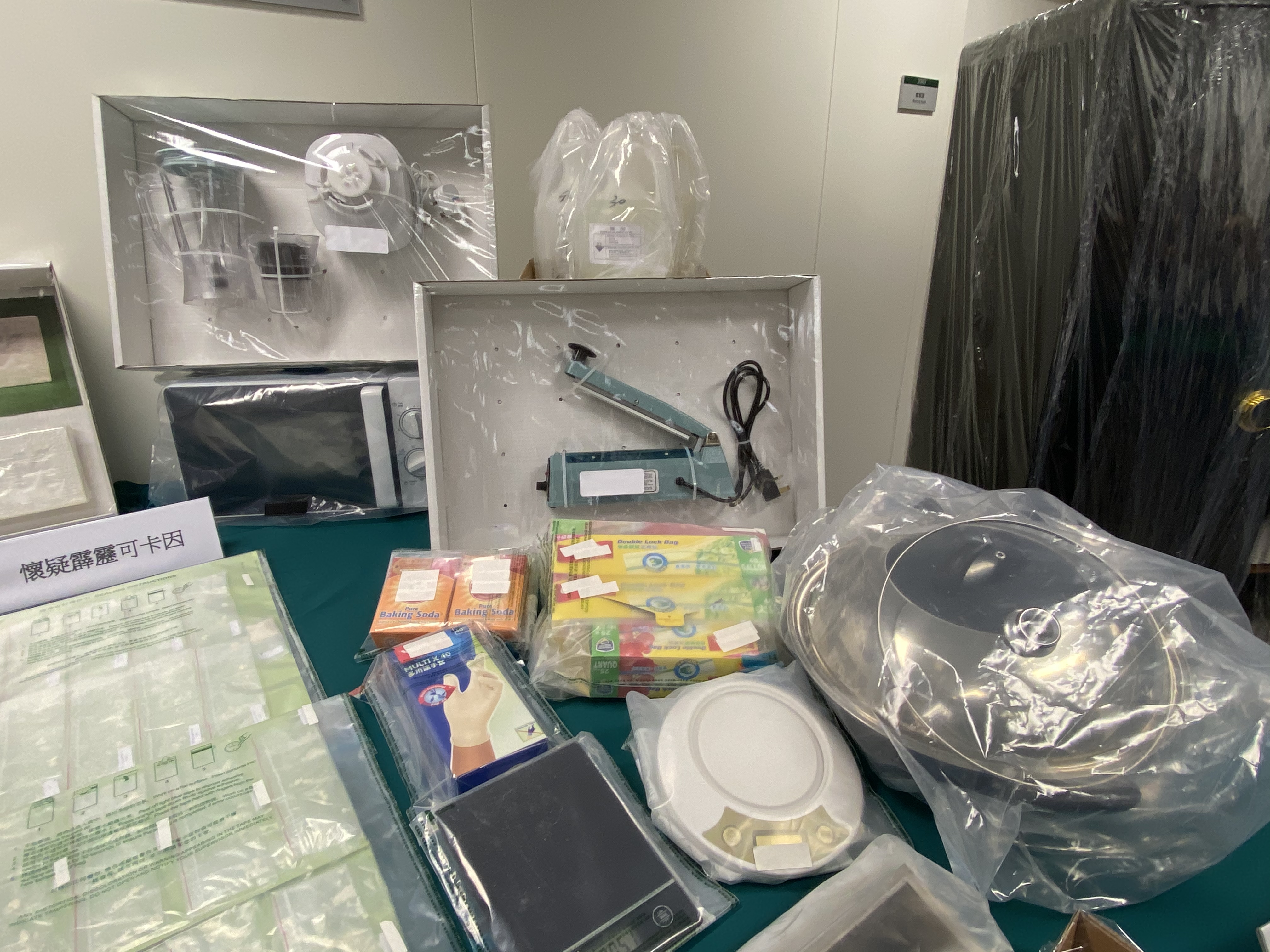 行動中檢獲的毒品、夾萬和製毒工具。