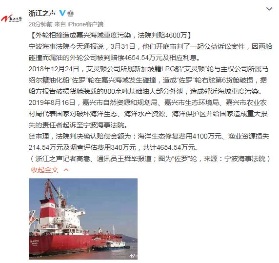 據浙江之聲消息,寧波海事法院今日通報称,3月31日該院開庭審判了一起公益訴訟案件,因兩船碰撞而漏油的外輪公司被判賠償4654.54萬元及相應利息。